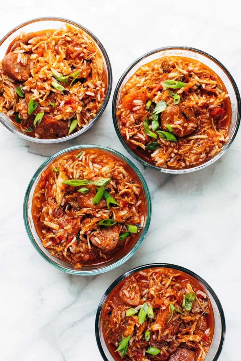 Creole Chicken and Sausage – Meal Prep Style! Shredded chicken, andouille sausage, creole seasoning, a rich tomato sauce, veggies, and rice. Made in the Instant Pot or slow cooker!