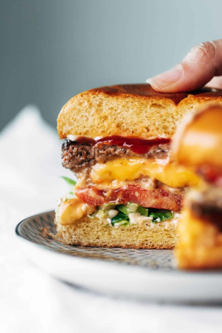 A delicious hamburger stuffed with molten, bubbly, waterfalling cheese, all piled on a buttery toasted bun with all the fixings. The BEST.