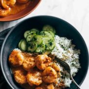 - Finish: Add the sauce and simmer for another 5 minutes or so. Serve shrimp over rice, with a salad or some fresh zippy cucumbers.