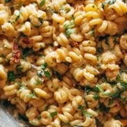 You are thisclose to enjoying Creamy Garlic Sun-Dried Tomato Pasta! Garlicky spirali noodles and tender sun-dried tomatoes in a creamy, luscious sauce with a heavy dusting of Parmesan cheese.