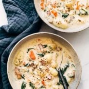 I’ve been super sick this past weekend and was looking for a soup recipe that would come together easily. I followed the recipe as is and made this in the Instant Pot because I wanted it done quickly. This soup was off the charts good!! So much flavor and just the right amount of creamy. I served it with chunks of store bought sourdough bread and the pairing was amazing. I did have to add water to the left overs as the gnocchi soaked up a good amount of the broth but the flavor profile was intact even with the added water. 10/10 – this will be a regular in my household!