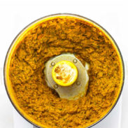 - Once the aromatics are finished in the oven, blend everything up in a food processor or a high-powered blender to form a yellow paste to your desired consistency. Smooth paste or something a lil’ more chunky? Both work! Boom! How simple is that?