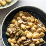 Say hello to a steaming bowl of gnocchi swimming in a silky creamy sauce that’s laced with thyme and loaded with little slips of garlic butter-browned mushrooms. Dust the whole thing with Parm and some freshly ground black pepper… it’s elite.