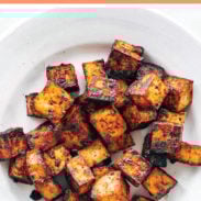 Step 4: Transfer tofu to parchment lined baking sheet. Bake at 400°F for 35-40 minutes, flipping halfway through. Marinade can be reserved and brushed onto tofu during the baking process for extra flavor.