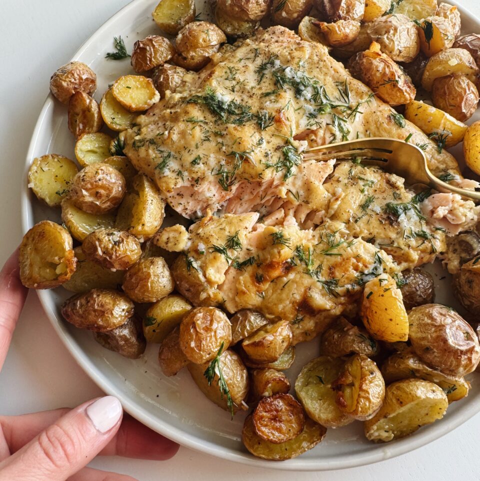 Simple and delicious salmon and potatoes roasted on a sheet pan, and covered in a garlic dill butter sauce! One of my family’s favorite dinners.