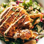 They are golden brown, crispy, spicy, barely sweet and savory little bundles of flavor. You can serve them on a fluffy brioche bun with some spicy mayo and slaw, or just go bun-less and tuck these crispy flavor bombs straight into a salad, which is how I like them – just nestled onto some dressed spring greens, or a bagged salad mix, with a squiggle of spicy mayo on top.