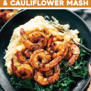 Spicy Shrimp with Cauliflower Mash and Garlic Kale – tender-sweet shrimp and smoky garlic kale over creamy cauliflower mash. The most DELICIOUS fake-fancy weeknight dinner!
