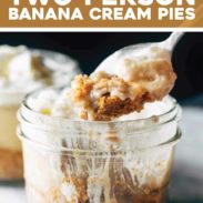 Being that I only have two adults and a baby in my house, and being that banana cream pie doesn’t really keep well as leftovers, I have stumbled into a new routine of making these two-person banana cream pies in ramekins or jars. Can’t exactly call them mini, because even though they are meant to serve just one person, these pies are deep-dish level big boys that are packed to the brim with graham cracker crust, banana slices, creamy banana filling, and whipped cream.
